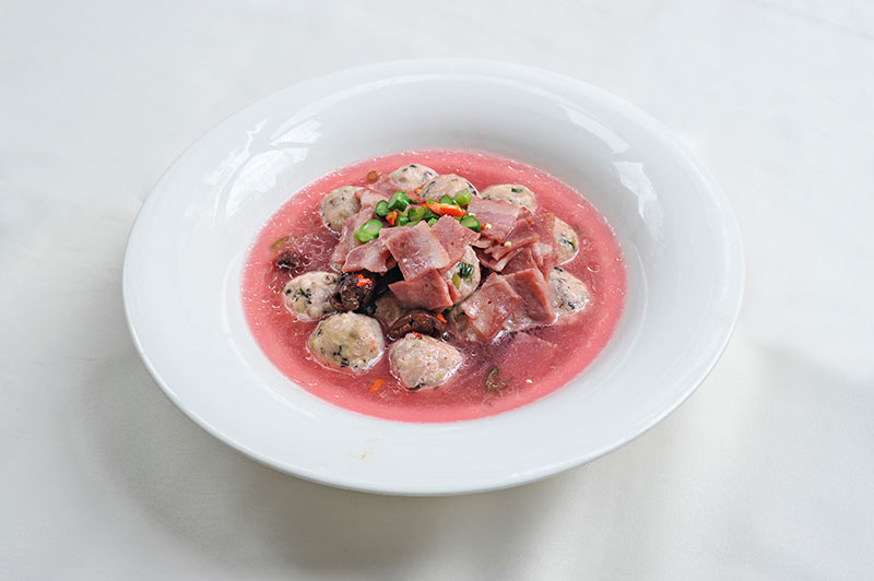 4.热油将丸子炸到表皮变黄后捞出,倒入红菇汤中,加入适量食盐,开锅后,倒入培根丁,即可出锅。