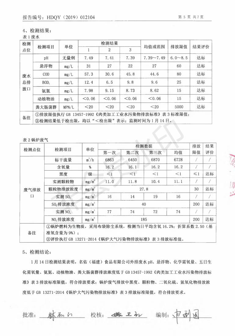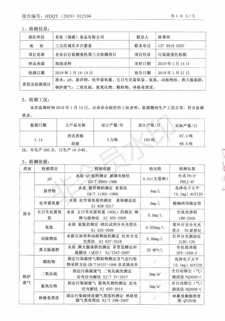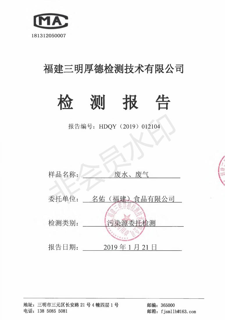 名佑(福建)食品有限公司2019年度环境自行监测方案信息